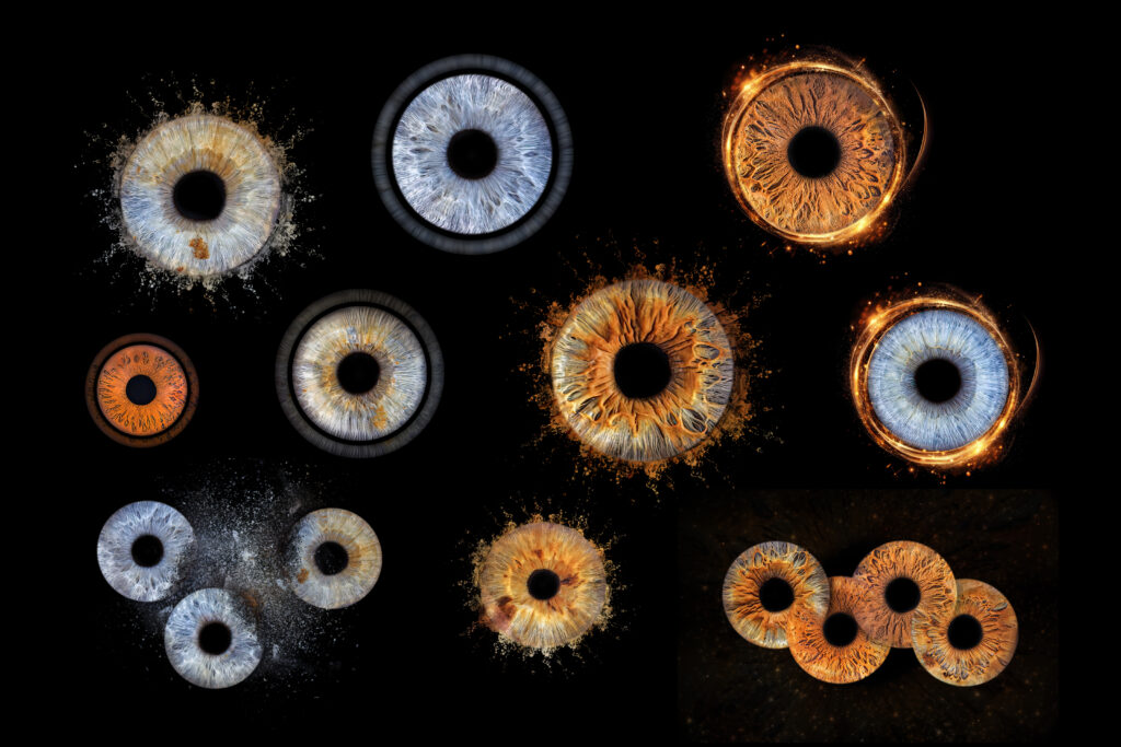 Les photos d’iris sont fournies en plusieurs versions : l’image de l’iris seul, deux montages artistiques, ainsi qu’un montage réunissant les iris de votre choix lorsque la séance concerne plusieurs personnes.
